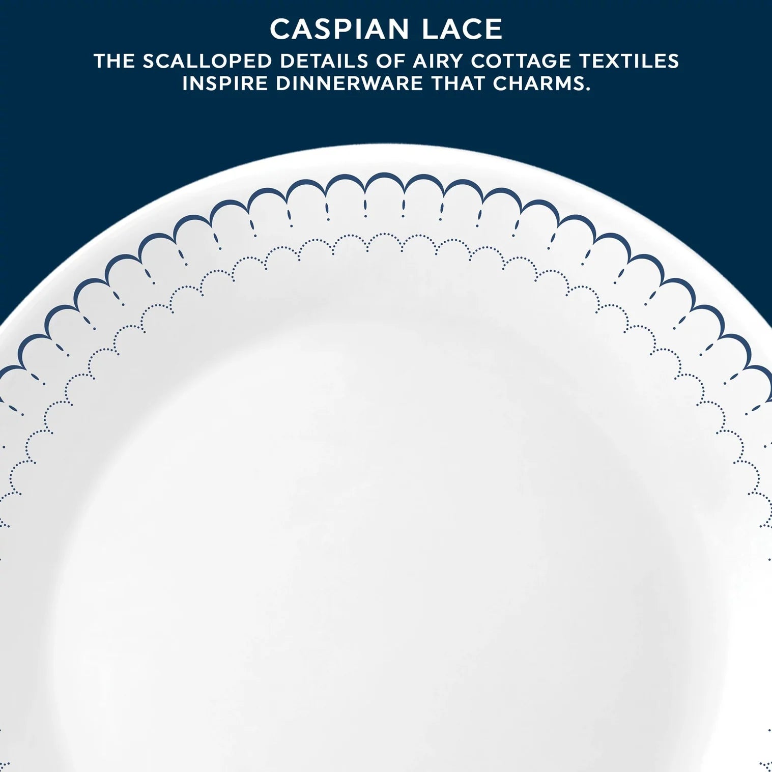 Crisp cottage textiles with delicate scalloped trim brings a gentle charm to this dinnerware set. Dishes in clean white with navy detailing feel airy and relaxed, and the perfect color palette for any setting.