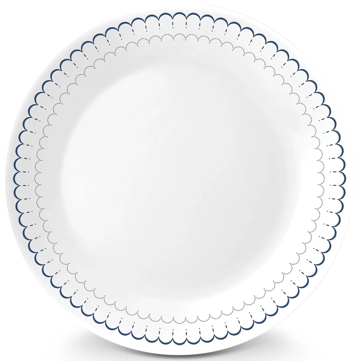 Crisp cottage textiles with delicate scalloped trim brings a gentle charm to this salad plate. Dishes in clean white with navy detailing feel airy and relaxed, and the perfect color palette for any setting.